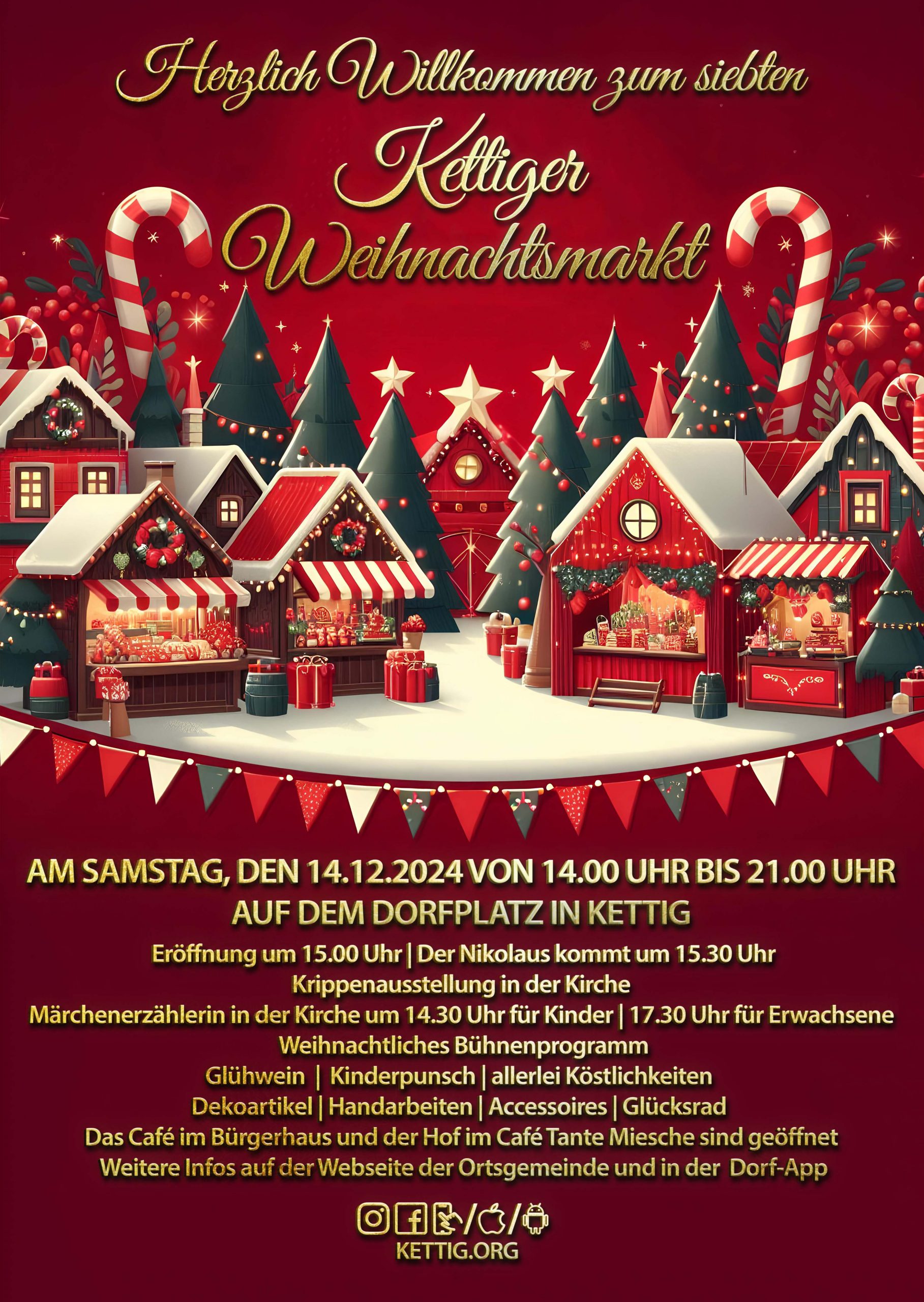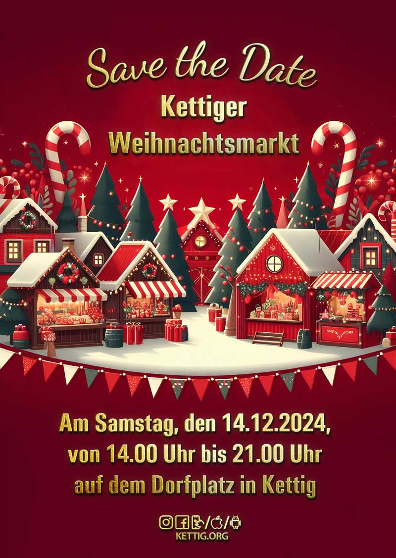 Ankündigungsgrafik „Save the Date“ für den Kettiger Weihnachtsmarkt 2024 Einsatz in der Dorf-App, der Webseite...